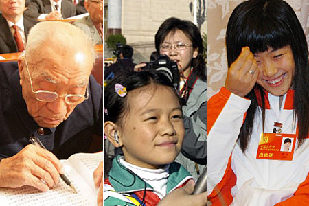 年齡最大的代表——方強(qiáng);年齡最小代表——女子佩劍運(yùn)動(dòng)員譚雪;年齡最小的記者——吳梓曼。