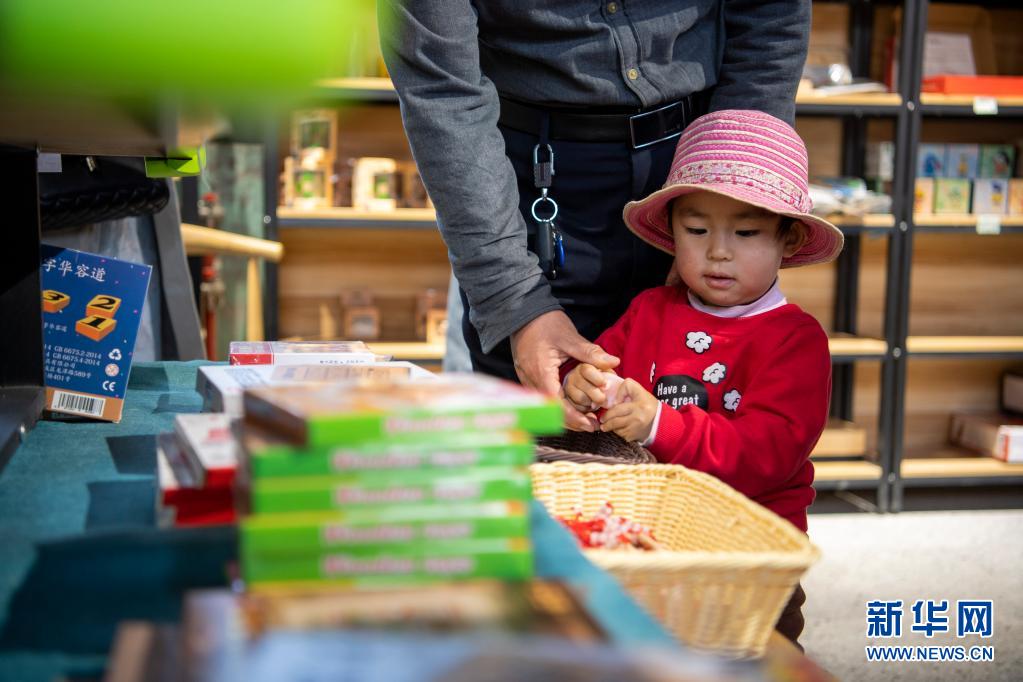5月4日,小朋友在太原古縣城的一家店鋪內(nèi)參觀游玩。