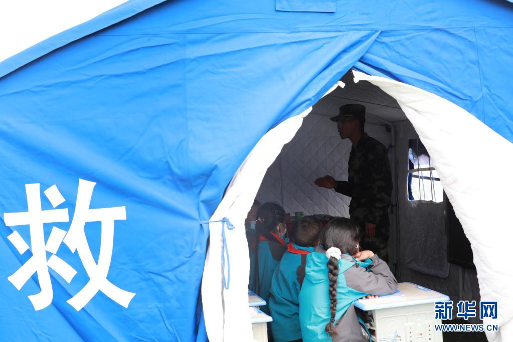 5月24日,武警青海總隊(duì)果洛支隊(duì)機(jī)動(dòng)大隊(duì)排長(zhǎng)張國(guó)睿為花石峽鎮(zhèn)藏文中心寄宿制小學(xué)的孩子上課。新華社記者 劉芳 攝