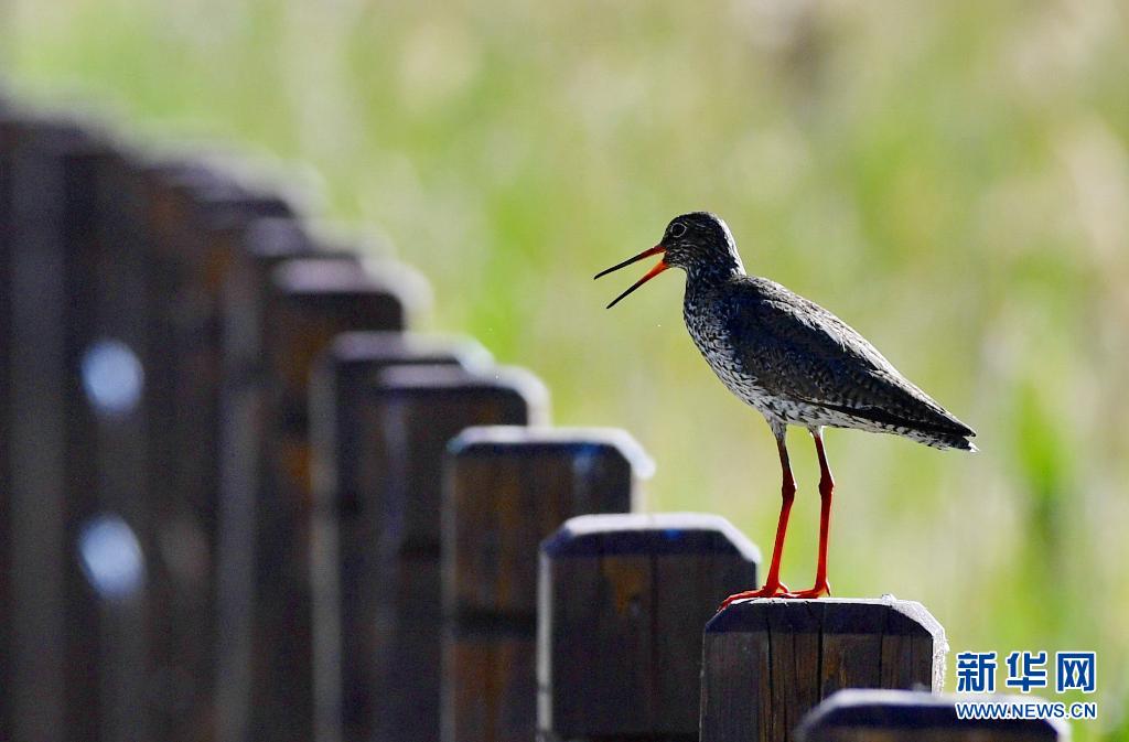 初夏,紅腳鷸在位于西藏拉薩的拉魯濕地國家級自然保護(hù)區(qū)內(nèi)起舞覓食。
