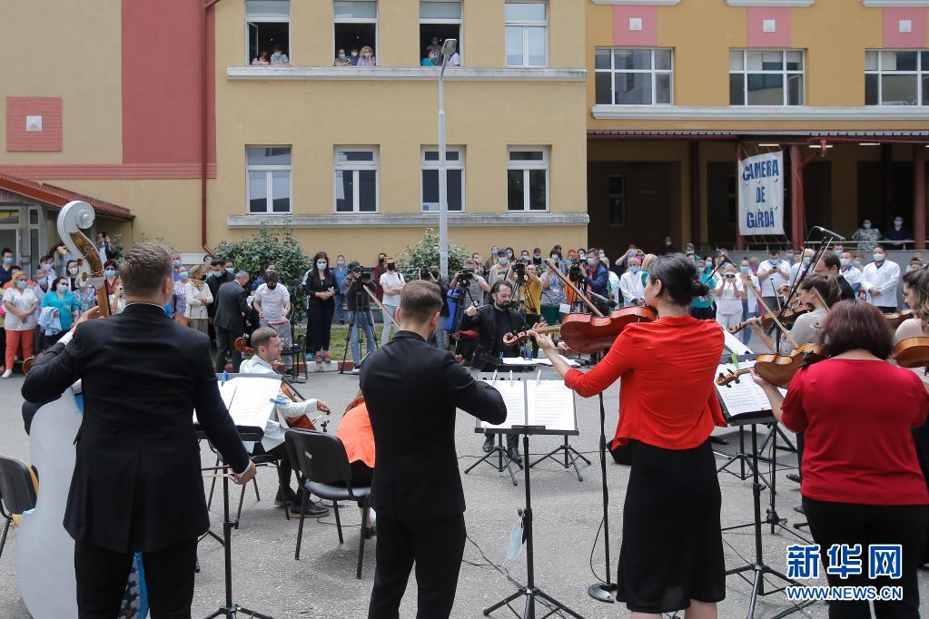 當(dāng)日,羅馬尼亞首都布加勒斯特一個樂隊在該國一家傳染病醫(yī)院——馬太·巴爾什醫(yī)院演出,向抗擊新冠疫情的醫(yī)務(wù)工作者致謝。