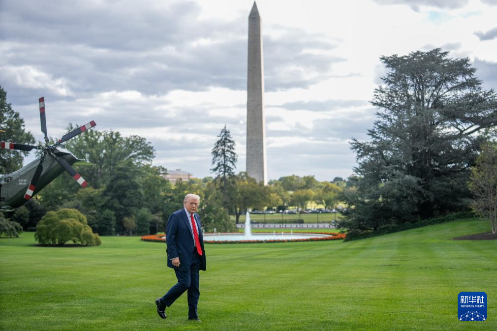 10月10日,在美国首都华盛顿,美国总统特朗普准备乘直升机离开白宫。新华社记者 胡友松 摄