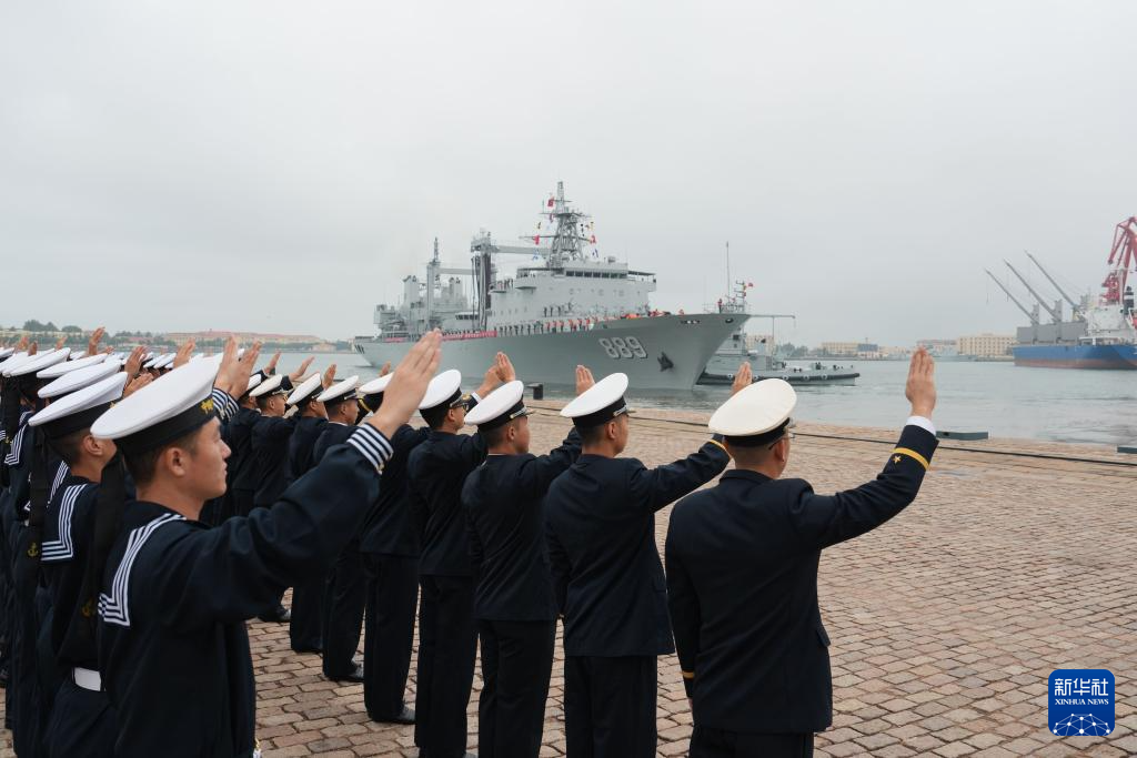 上午9时许,在雄壮的军乐声中,编队舰艇依次解缆,缓缓驶离码头。甲板上,护航官兵精神抖擞,整齐列队,向祖国和亲人挥手告别。