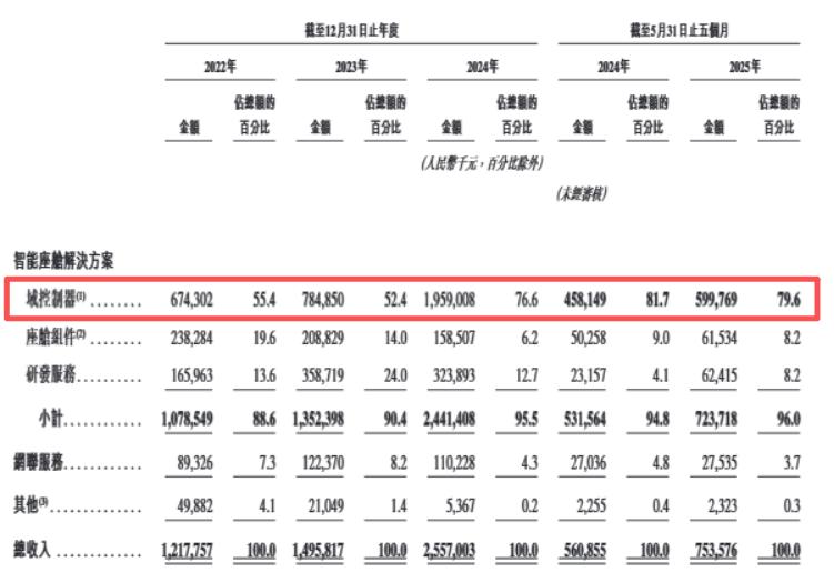 从收入结构来看,驱动这一增长的核心动力是其智能座舱解决方案中的域控制器产品。2022年至2024年,博泰车联域控制器收入从6.74亿元增长至19.59亿元,年复合增长率达70.5%,占总营收比例从55.4%提升至76.6%,带动其整体智能座舱解决方案收入占比突破95%,核心竞争力进一步强化。