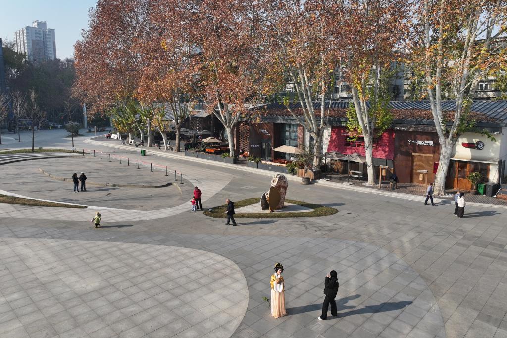 12月4日,游人在西安时光文化公园消费休闲(无人机照片)。这座公园是由西安国营第一钟表机械厂旧厂区改建而来的。
