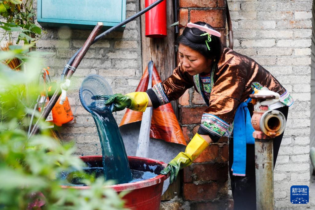乌英苗寨妇女梁足英用石灰加入蓝靛草浸泡水中调制染料(2023年8月31日摄)。
