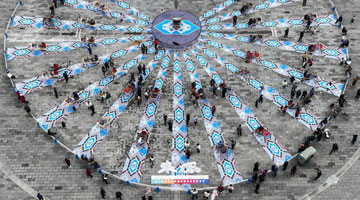 当日,数十名织锦女工在湖北省来凤县龙凤文化中心广场现场进行“西兰卡普”制作,普及非遗文化。