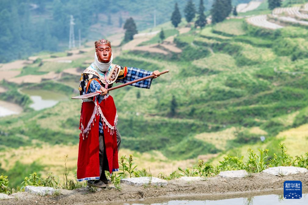 山环水抱的清泉村,海拔约千米。小满前后正是当地农忙插秧的时节。在一群头发花白的稻农中,阳戏艺人陈永霞、冷定祥、石茂昌、杨翠红、李兵、许霞章正躬身水田中熟练地插秧。对于世代生活在这片大山里的土家族村民来说,农事劳作是刻在他们骨子里的生存技能。