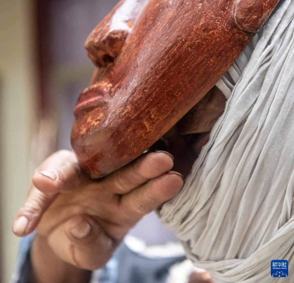5月16日,陈永霞在穿戴阳戏面具。
