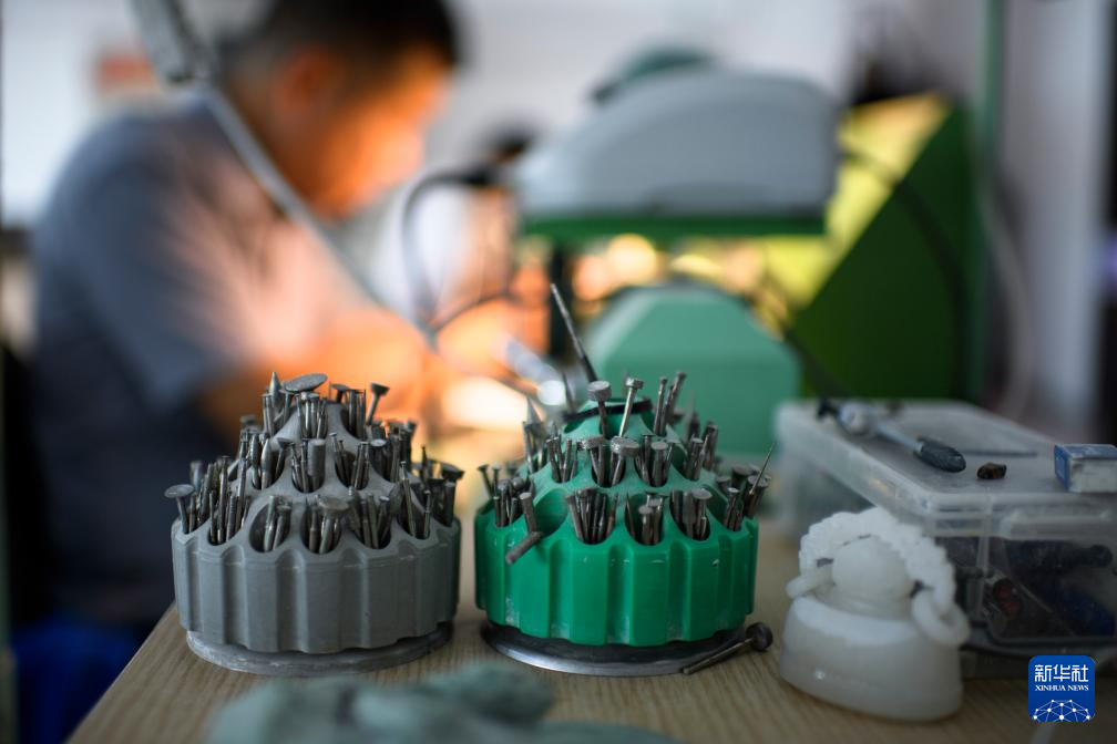 张铁成工作室内雕刻玉石的工具(6月15日摄)。