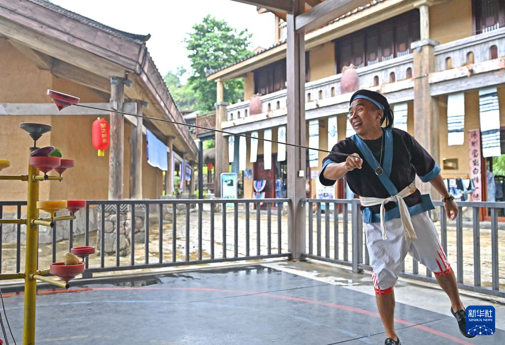 何光斌在南丹县里湖瑶族乡朵努社区展示徒手接陀螺(8月30日摄)。
