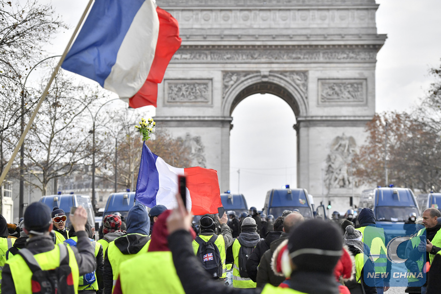 "Yellow Vests" protesters confront police near the Arch of Triumph in Paris, France, on Dec. 8, 2018. (Xinhua/Chen Yichen)