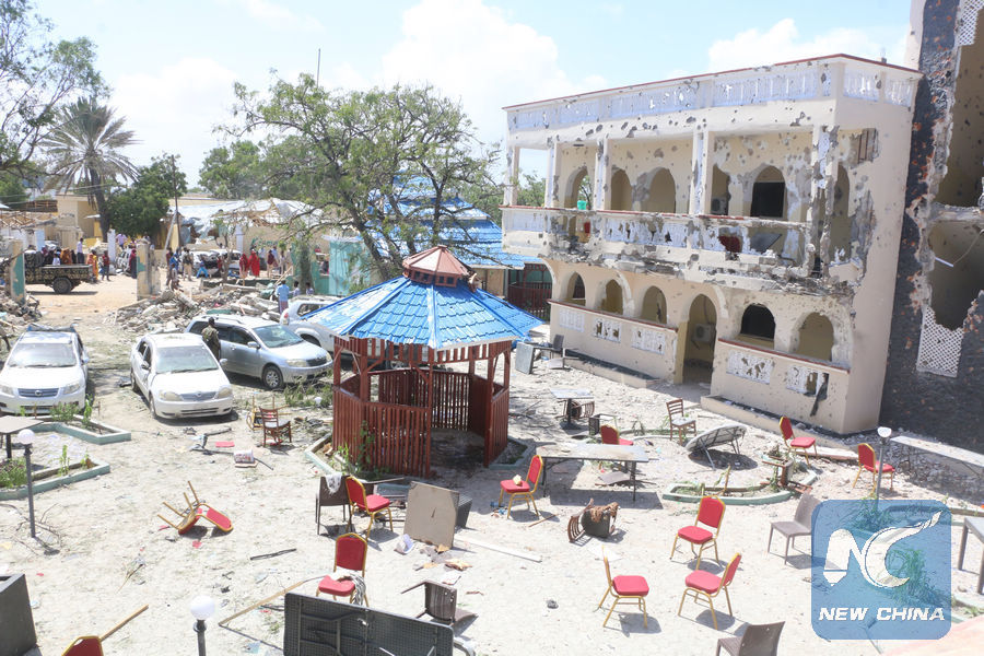 Destructed materials scatter Medina hotel in the southern port town of Kismayo after Al-Shabab militants attacked the hotel, killing more than 26 and wounding 56 others. (Xinhua)