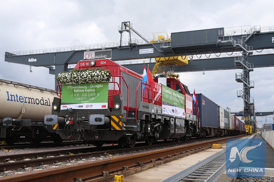 The firstLuxembourg-Chengdu freight train starts at a cargo train station in Dudelange, Luxembourg, April 4, 2019. (Xinhua/Zheng Huansong)