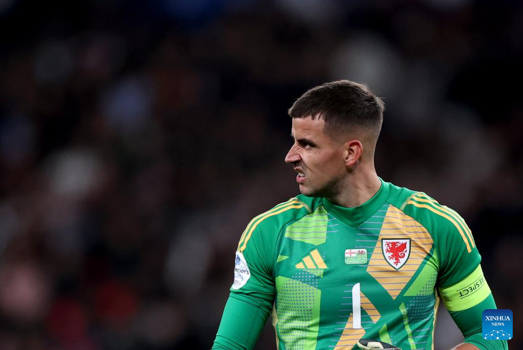 Wales' goalkeeper Karl Darlow reacts during a friendly football match between England and Wales at Wembley Stadium in London, Britain, Oct. 9, 2025. (Xinhua/Li Ying)