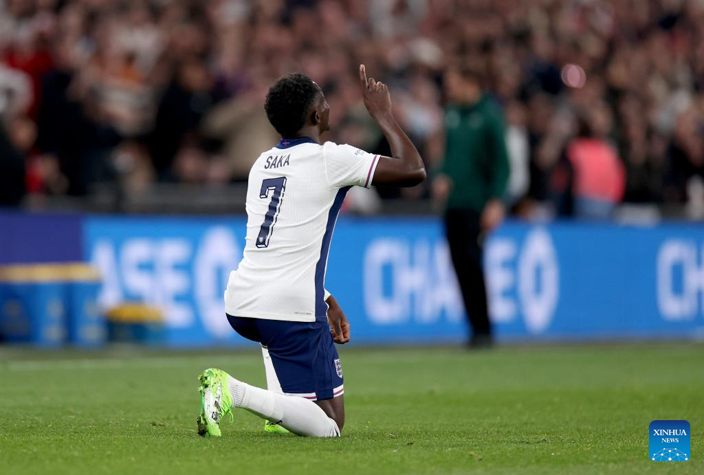 England's Bukayo Saka celebrates scoring his side's third goal during a friendly football match between England and Wales at Wembley Stadium in London, Britain, Oct. 9, 2025. (Xinhua/Li Ying)
