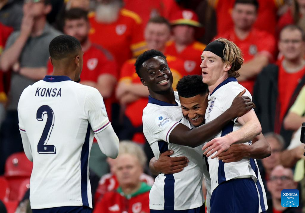 England's Bukayo Saka (C) celebrates scoring his side's third goal with his teammates Morgan Rogers (L) and John Stones during a friendly football match between England and Wales at Wembley Stadium in London, Britain, Oct. 9, 2025. (Xinhua/Li Ying)