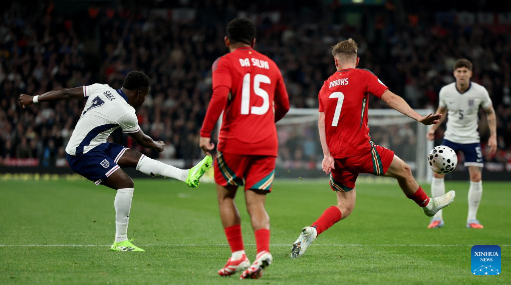England's Bukayo Saka (L) shoots during a friendly football match between England and Wales at Wembley Stadium in London, Britain, Oct. 9, 2025. (Xinhua/Li Ying)
