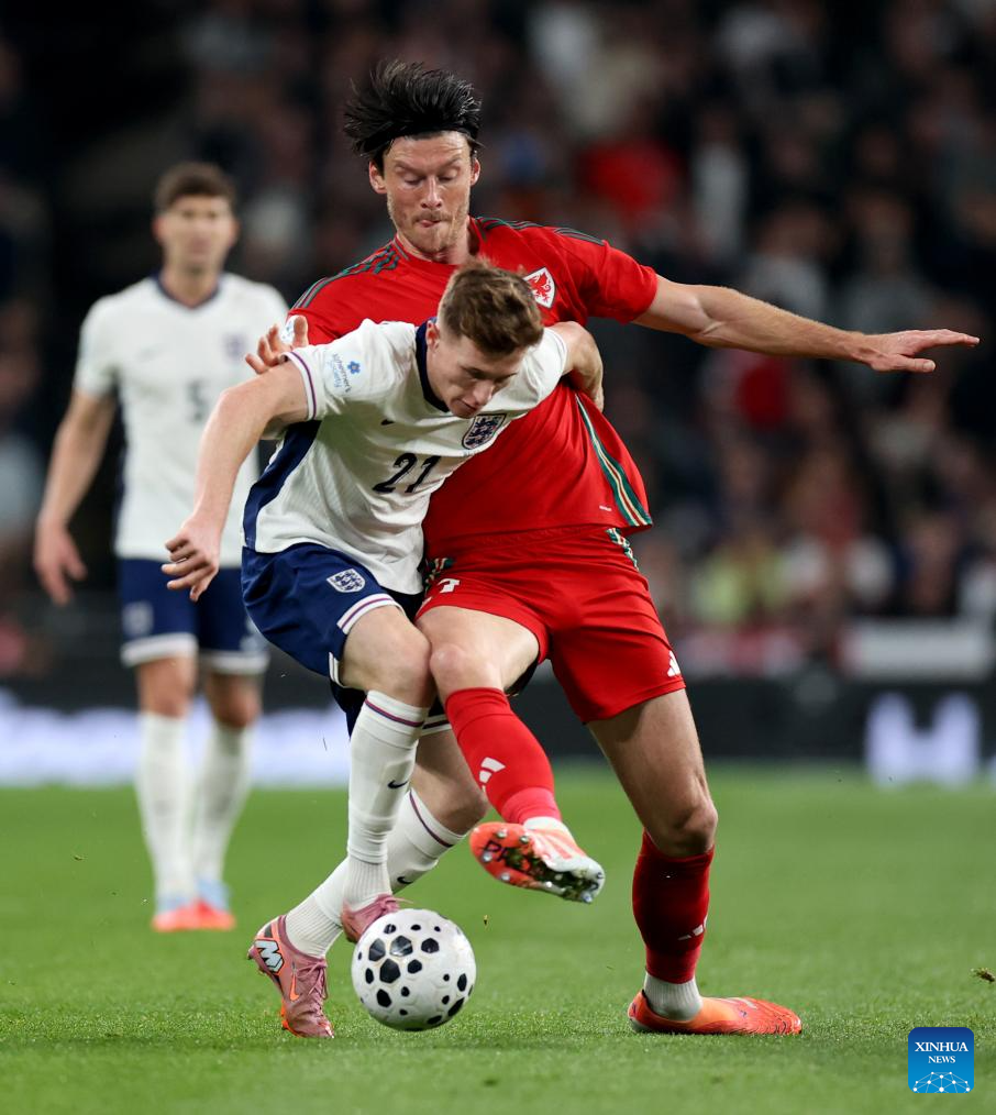 England's Jarrod Bowen (L) vies with Wales' Lewis Koumas during a friendly football match between England and Wales at Wembley Stadium in London, Britain, Oct. 9, 2025. (Xinhua/Li Ying)