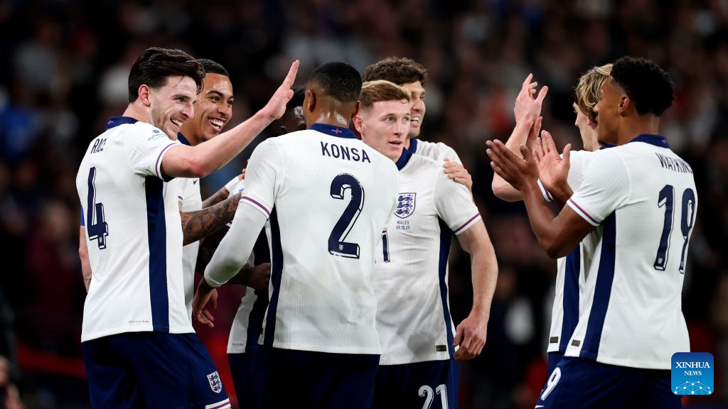 England's players celebrate scoring during a friendly football match between England and Wales at Wembley Stadium in London, Britain, Oct. 9, 2025. (Xinhua/Li Ying)