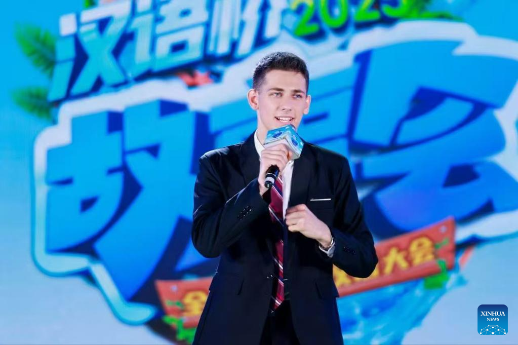 This photo taken in April 2025 shows Azerbaijani youth Ravanov Eldar, known in China as He Yan, competing in a regional preliminary round of the storytelling contest of the 2025 "Chinese Bridge" Chinese Proficiency Competition for Foreigners across the Globe, in north China's Tianjin. (Xinhua)