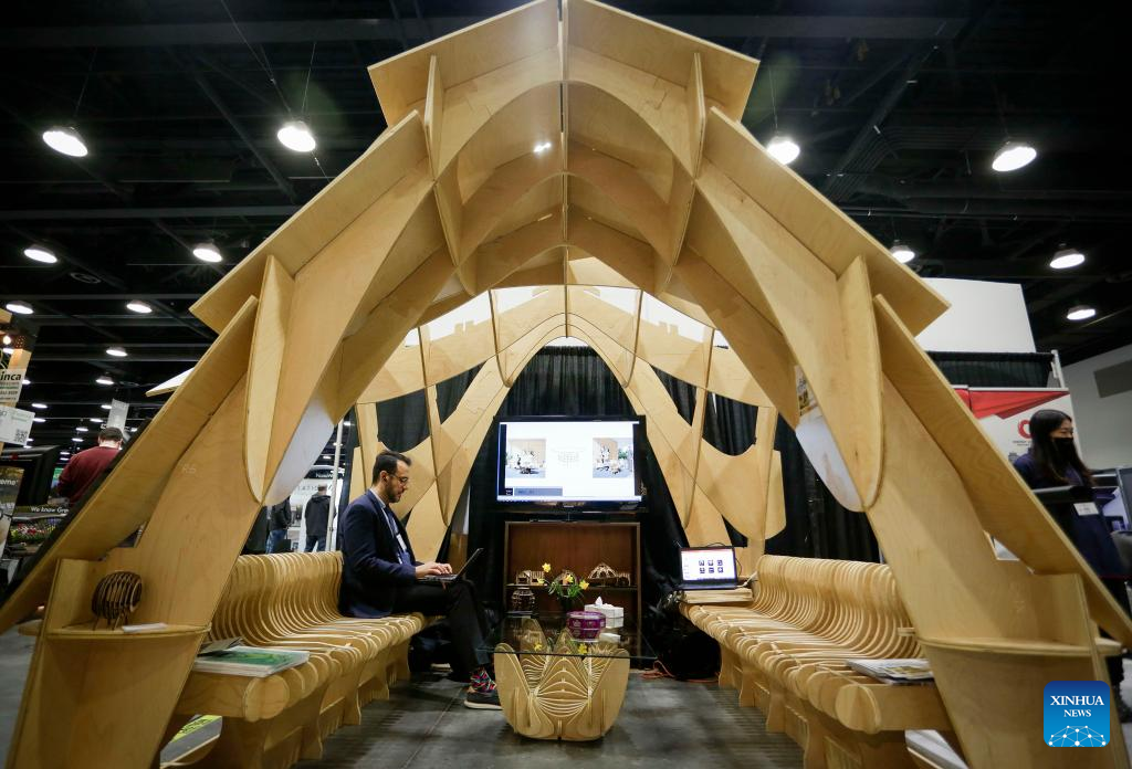 An architectural structure made from plywood panels is displayed during the 2022 BUILDEX show in Vancouver, British Columbia, Canada, on March 23, 2022. As one of Canada's largest conferences and trade shows for building industry, the 2022 BUILDEX Vancouver kicked off on Wednesday, showcasing the latest building materials, products and technologies. (Photo by Liang Sen/Xinhua)