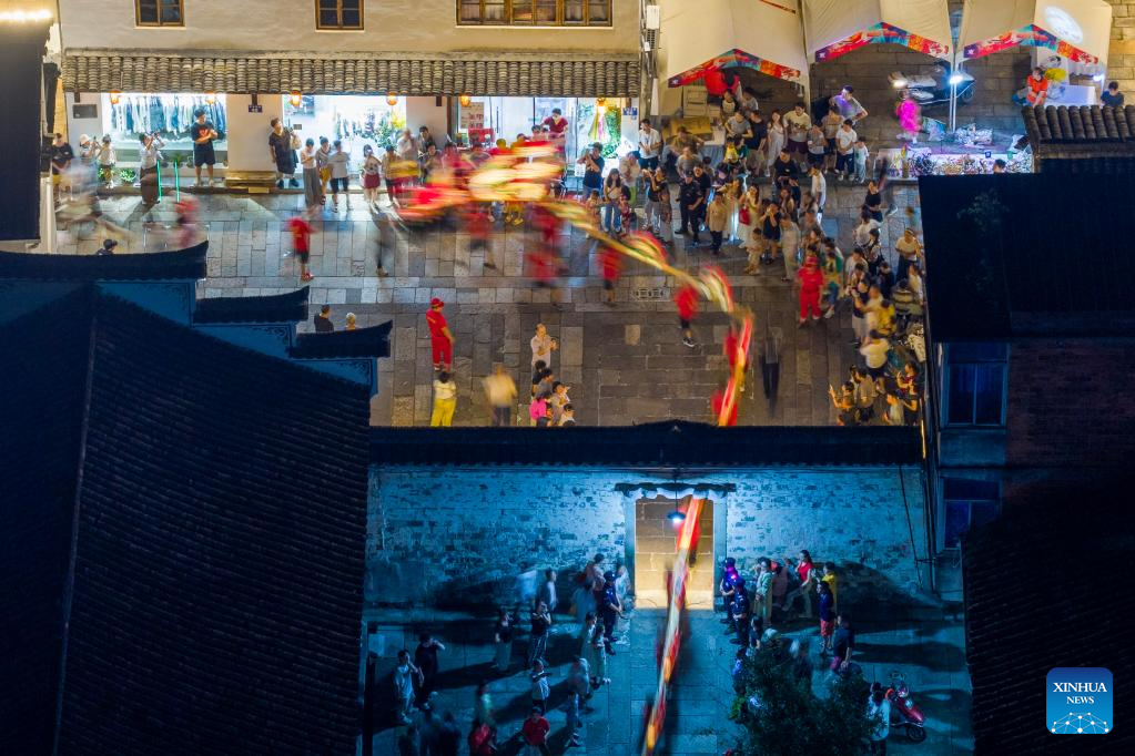 An aerial drone photo taken on Oct. 5, 2025 shows people watching a wooden-bench dragon parade in Pujiang County, east China's Zhejiang Province. China recorded 888 million domestic tourist trips during the eight-day National Day and Mid-Autumn Festival holiday, up 123 million from the seven-day National Day holiday in 2024, the Ministry of Culture and Tourism said Thursday.