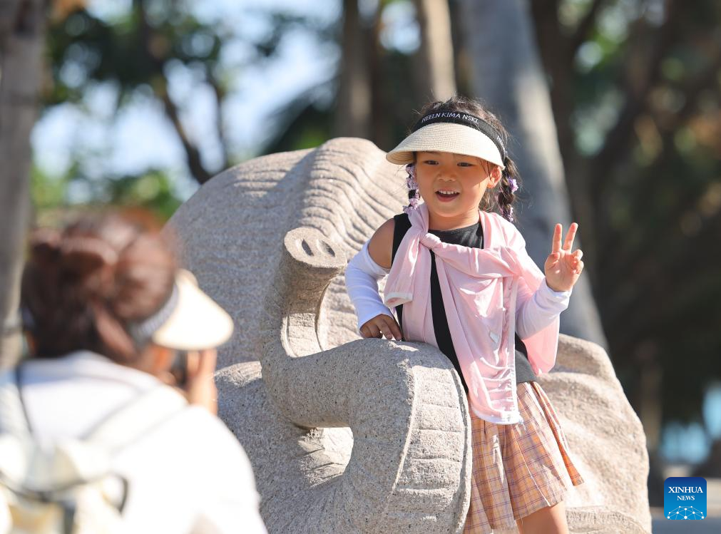 A girl poses for photos at Nanshan Cultural Tourism Zone in Sanya, south China's Hainan Province, Oct. 8, 2025. China recorded 888 million domestic tourist trips during the eight-day National Day and Mid-Autumn Festival holiday, up 123 million from the seven-day National Day holiday in 2024, the Ministry of Culture and Tourism said Thursday.