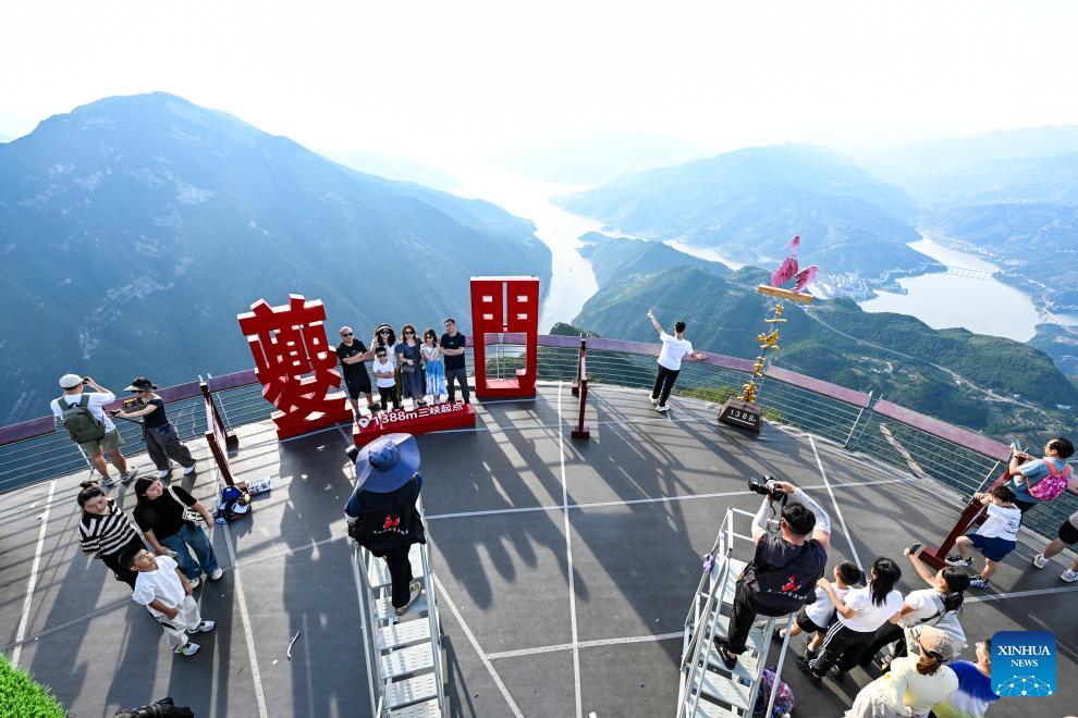 People visit a scenic spot in Fengjie County, southwest China's Chongqing, Oct. 5, 2025. China recorded 888 million domestic tourist trips during the eight-day National Day and Mid-Autumn Festival holiday, up 123 million from the seven-day National Day holiday in 2024, the Ministry of Culture and Tourism said Thursday.