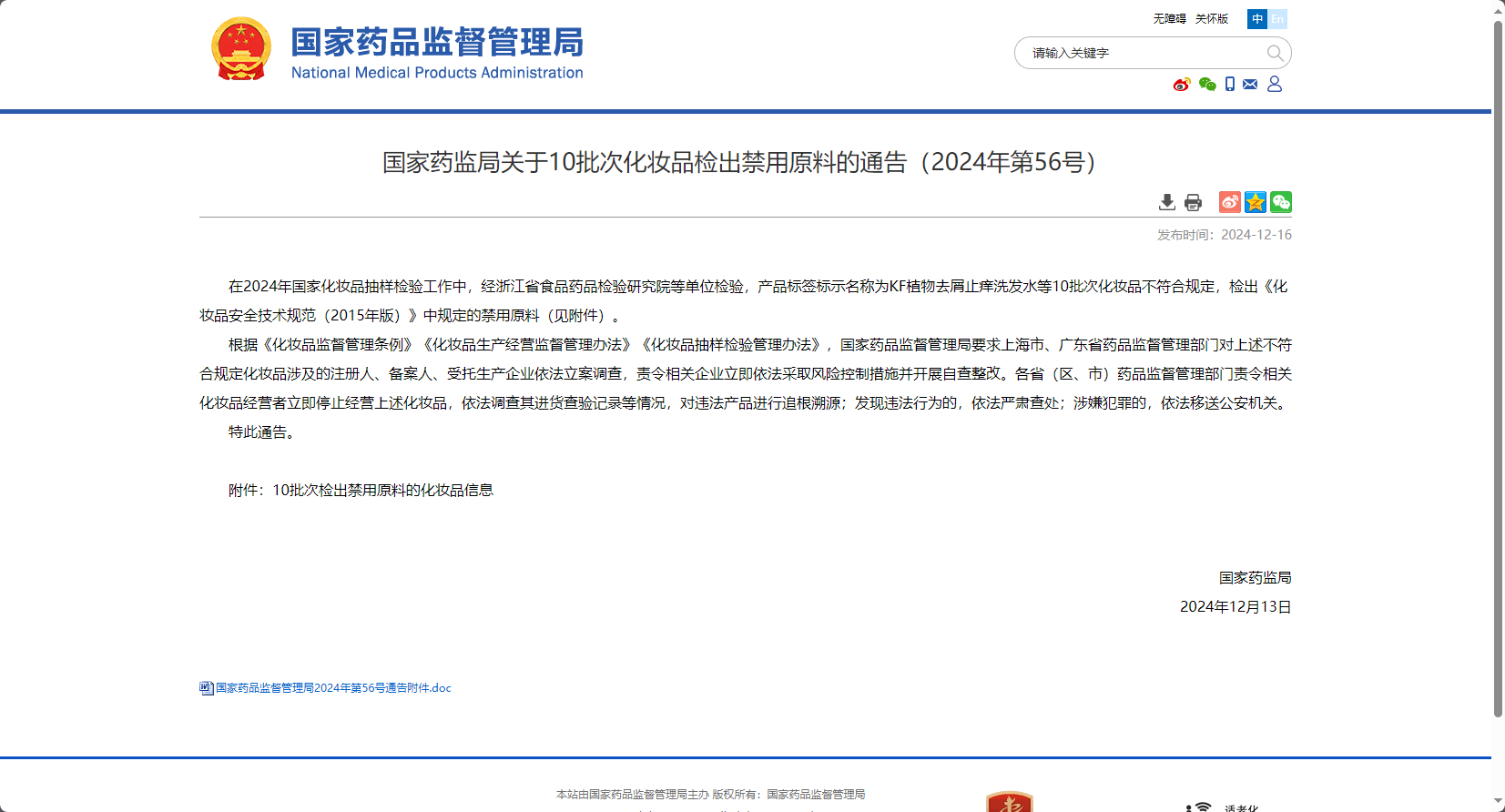 國(guó)家藥監(jiān)局關(guān)于10批次化妝品檢出禁用原料的通告(2024年第56號(hào))