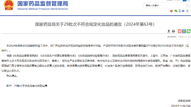 國(guó)家藥監(jiān)局關(guān)于29批次不符合規(guī)定化妝品的通告(2024年第63號(hào))