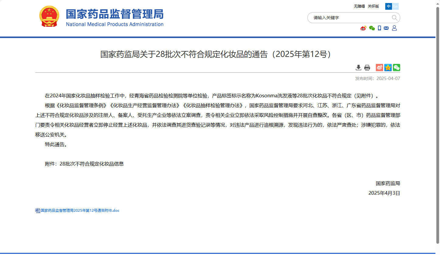 國(guó)家藥監(jiān)局關(guān)于30批次不符合規(guī)定化妝品的通告(2025年第14號(hào))