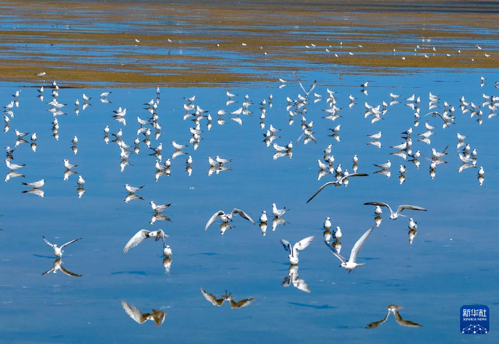 9月15日,候鸟在江苏东台条子泥湿地栖息、觅食(无人机照片)。