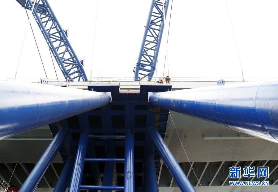 “冒出來”的并不是一座完整的大橋,而是一段跨徑長(zhǎng)達(dá)200米的雙拱鋼橋,在海面中央兀然矗立?!斑@是我們大橋工程最核心的主橋部分,技術(shù)難度最大,對(duì)整個(gè)項(xiàng)目有里程碑的意義?!背薪▎挝恢袊窐蚬こ逃邢薰径?、項(xiàng)目總指揮闞軍說。