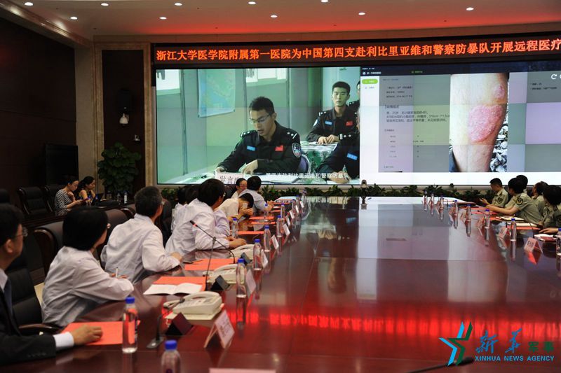 ????由中國(guó)第四支駐利比里亞維和警察防暴隊(duì)、浙江邊防總隊(duì)和浙江大學(xué)醫(yī)學(xué)院附屬第一醫(yī)院共同發(fā)起的“警民遠(yuǎn)程醫(yī)療協(xié)作”日前啟動(dòng)。6位醫(yī)療專家通過遠(yuǎn)程視頻系統(tǒng),為遠(yuǎn)在利比里亞的患病隊(duì)員進(jìn)行會(huì)診。