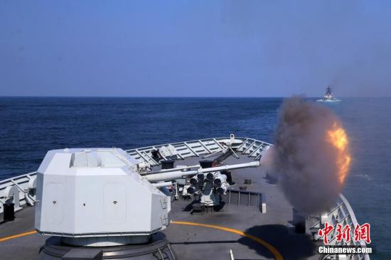 9月18日,“黃山艦”主炮開炮。當日,中俄“海上聯(lián)合-2016”軍事演習展開實際使用武器演練。 中新社記者 韓海丹 攝