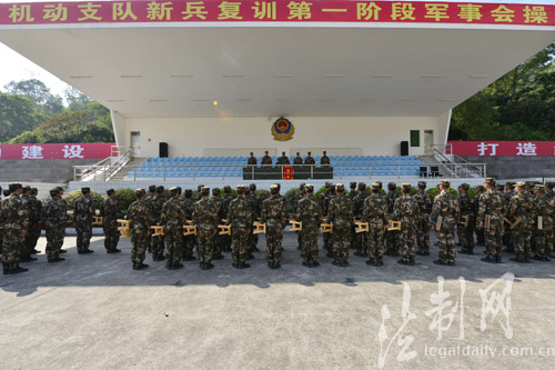 圖為機(jī)動支隊(duì)新兵復(fù)訓(xùn)第一階段軍事會操前隊(duì)伍集結(jié),做動員講話