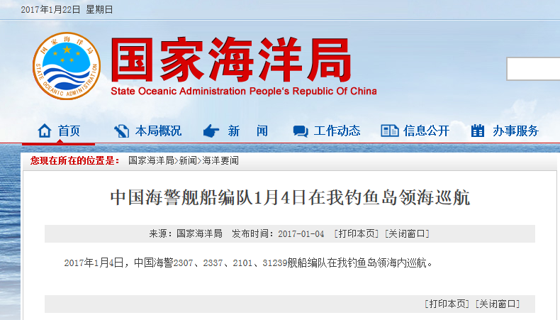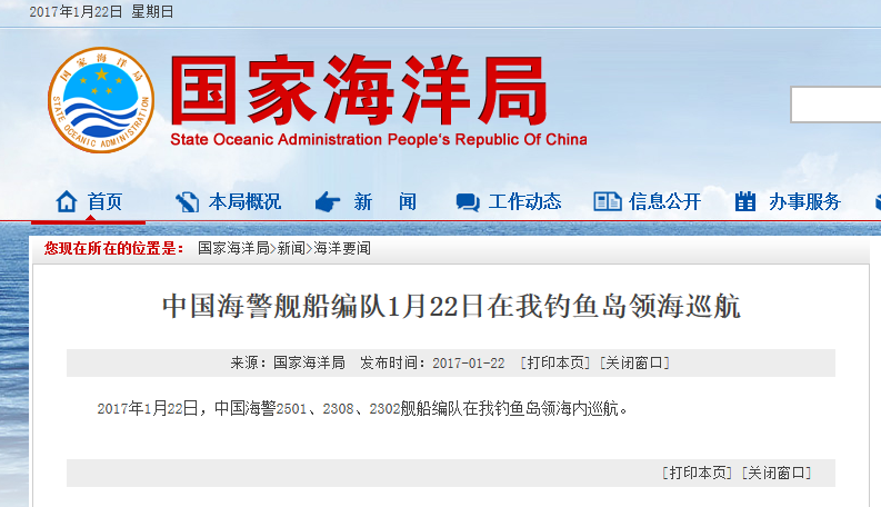 新華網(wǎng)北京1月22日電 據(jù)國(guó)家海洋局網(wǎng)站報(bào)道,2017年1月22日,中國(guó)海警2501、2308、2302艦船編隊(duì)在我釣魚島領(lǐng)海內(nèi)巡航。