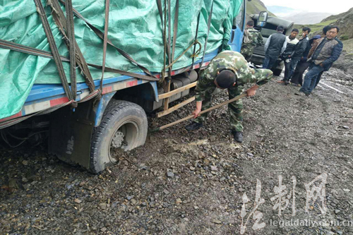 ????連日來,受強(qiáng)降雨天氣影響,通往西藏山南市錯那縣卡達(dá)鄉(xiāng)道路因山體塌方和泥石流損毀嚴(yán)重,7月23日中午12時,西藏邊防總隊山南邊防支隊卡達(dá)邊防派出所接轄區(qū)居民電話報警稱:商店運(yùn)貨貨車在返回卡達(dá)鄉(xiāng)途中陷入泥潭,請求派出所救援。接到消息后,該所迅速組織官兵趕往現(xiàn)場,并持續(xù)關(guān)注道路情況和受困狀況。到達(dá)現(xiàn)場后,邊防官兵立即展開救援,用十字鎬挖、用手刨、用人推,經(jīng)過2個小時的不懈努力,最終成功把陷入泥坑的貨車?yán)?。救援結(jié)束后,邊防官兵就近取材把泥坑填平,并設(shè)立警示標(biāo)志,確保后續(xù)車輛順利通過?,F(xiàn)場無人員受傷,車輛完好。