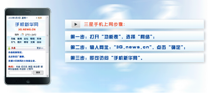 三星:依次選“上網(wǎng)鍵”-“收藏夾”-選擇一個空的收藏夾地址-確認(rèn)url地址-輸入“手機新華網(wǎng)”