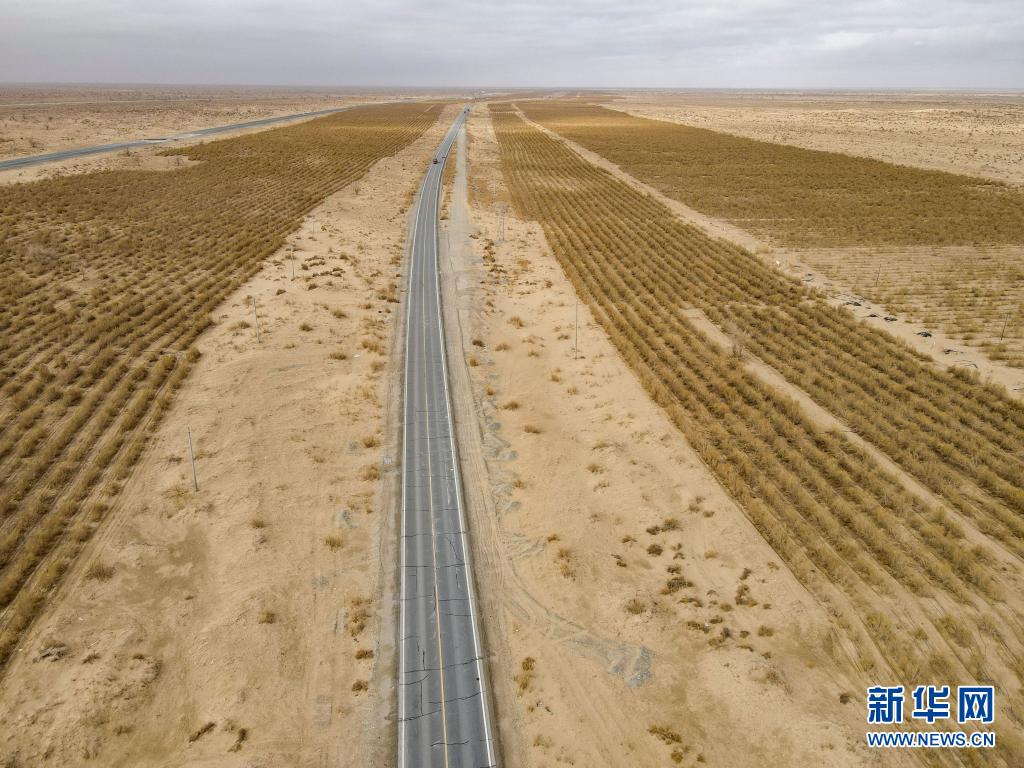 這是且末縣國道旁種植的生態(tài)梭梭林 (3月31日攝,無人機(jī)照片)。新華社記者 高晗 攝
