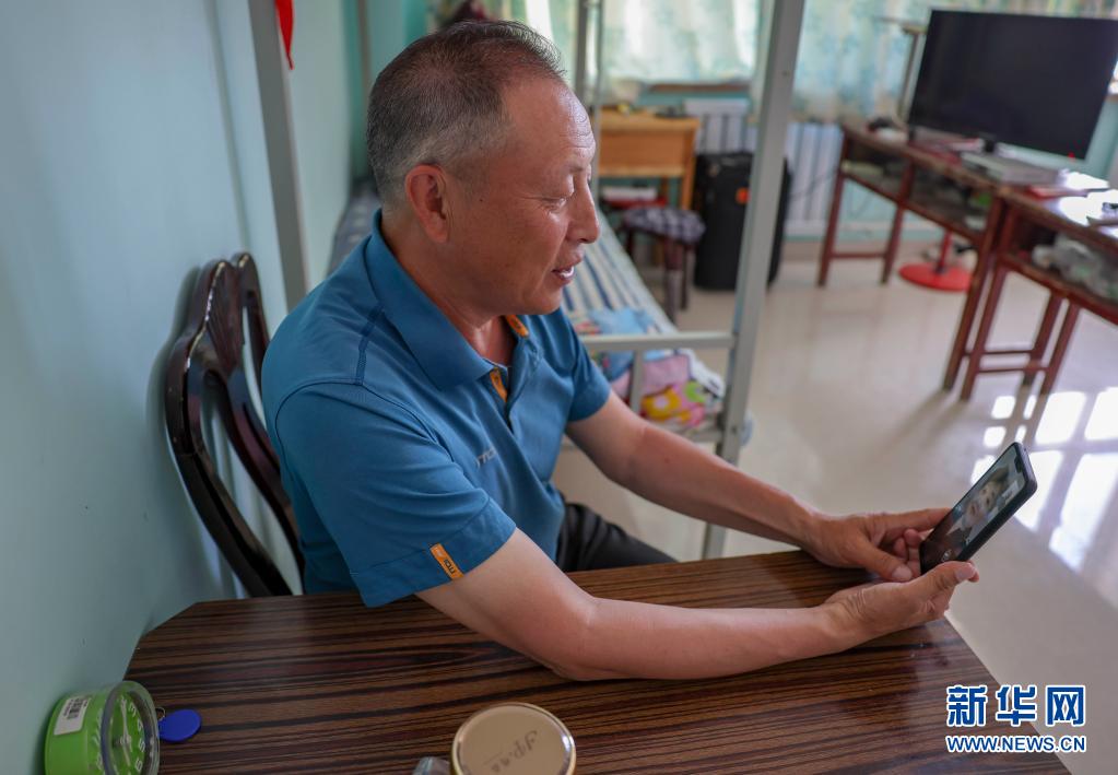 杜寶柱在塔城市第二小學宿舍內和遠在內蒙古的家人視頻聊天(6月12日攝)。