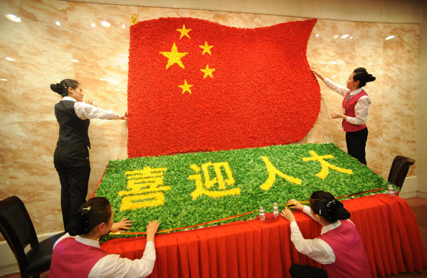 3月2日,京西賓館的服務員用絹花拼出國旗和“喜迎人大”的圖案。當日,為了迎接全國人大代表入住,京西賓館的服務員自發(fā)設(shè)計,并從市場上采購來絹花,在餐廳拼出組合圖案,表達“喜迎人大”的心情。