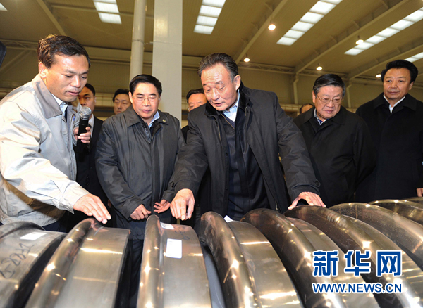 ????11月19日至23日,全國人大常委會委員長吳邦國在山西調(diào)研。這是11月20日,吳邦國在太原重工集團高速輪對國產(chǎn)化項目現(xiàn)場詳細了解工藝流程和技術(shù)指標。 新華社記者 李濤 攝