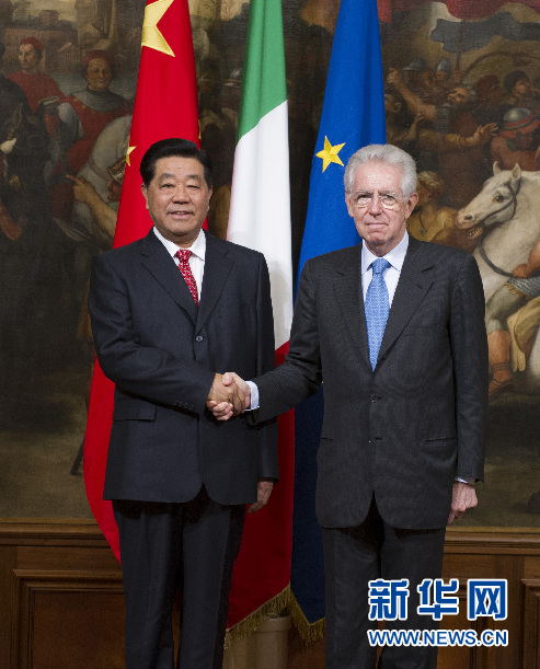 ????當(dāng)?shù)貢r(shí)間11月28日,全國(guó)政協(xié)主席賈慶林在羅馬會(huì)見意大利總理蒙蒂。(來源:新華社記者 李學(xué)仁 攝)
