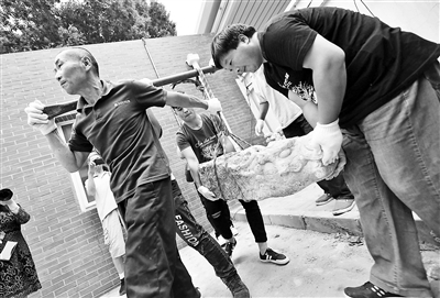 在昨天的文物搬運(yùn)現(xiàn)場(chǎng),兩位工人挑擔(dān)子,兩位工人用手托住龍頭兩邊,四人費(fèi)了好大勁才將螭頭搬到車上,開啟“回家”之路。待螭頭到達(dá)圓明園后,將有專家對(duì)它們進(jìn)行全身“體檢”,制定修復(fù)方案?!斑@些螭頭有一些小裂縫,如果不好好保護(hù),時(shí)間久了容易出問(wèn)題?!眻A明園文物考古科科長(zhǎng)陳輝說(shuō)。(記者 李夢(mèng)婷)