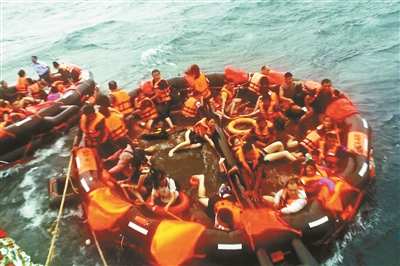 救生艇后來并沒有及時折回來搭救張峰,他只能抓住一串浮球,繼續(xù)等待。