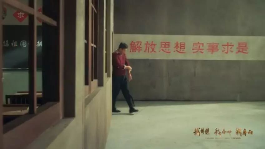 ??? 片中人們喜迎大會,共同分享這一紀念性的時刻,我們看到的背景墻上寫著“解放思想,實事求是”體現(xiàn)了時代精神。警察、郵遞員、工廠女工、老人、學生和年輕人的服裝,按照當年的樣式進行還原,并且全部進行重新制作,完全還原了當時的場景。