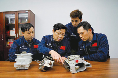 4月3日,王曙群(左二)給團(tuán)隊(duì)成員講解對接機(jī)構(gòu)組件的裝配要領(lǐng)。新華每日電訊記者張建松攝