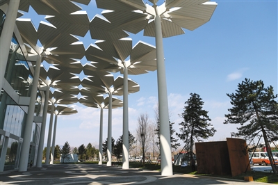 國際館由94把“花傘”構(gòu)成,建筑師在若干朵“花傘”下留出開放的公共空間,像一個城市遮陽傘,為人們提供一個遮陽的休憩區(qū)。